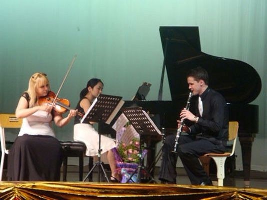 晚上6点30,十二星座(ZODIAC)三重奏的三位音乐家走进了校大剧院内。在中国北京吴氏文化传播有限公司的主办下,在宁波职业技术学院的承办下,三位音乐家在大剧院内举办了《小提琴 单簧管 钢琴 三重奏音乐会》为宁职音乐爱好者展现了一场精彩的单簧管、小提琴、钢琴相互配合的魅力音乐会,。