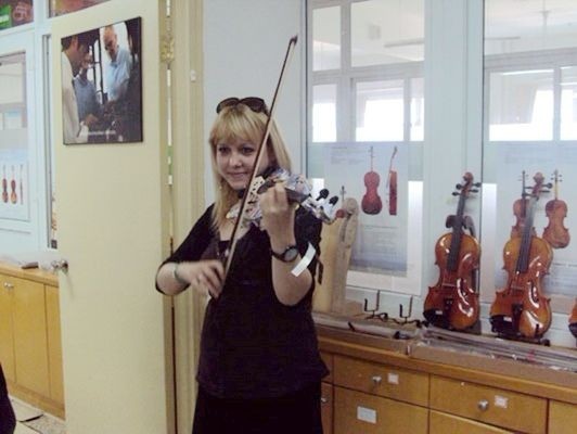 ▲ 小提琴演奏家瓦妮莎.默拉德(VANESSA MOLLARD)现场对同学们所做的乐器进行试拉,并对其发出的优美音色进行称赞