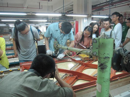乐器制造系今年招收的是钢琴制造专业方向班,该班自9月份入学以来,经过了军训,始业教育,今天上午又披着蒙蒙细雨驱车来到了校企合作单位——海伦钢琴股份有限公司参观。海伦钢琴公司办公室秘书种铮主任热情地接待了我们,并全程陪同向我们师生一一介绍了钢琴制造、装配、调试等关键工序。使同学们身临其境的感触到我国高质量的钢琴制造现场的磅礴场景。