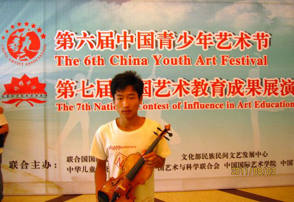 我很感谢中国艺术家协会浙江省组委会、中国艺术家协会、中国教育事业促进会、文化部民族民间文艺发展中心以及中国青少年艺术节组委会给我这次机会,能让我在这次的第六届中国青少年艺术节参加展演,让我这一个靠吃助学金从农村里出来的贫困学子也能够站在这里,与全国大中小幼颇有艺术才华的同学们一起共同切磋技艺,对此深表万分的感激。