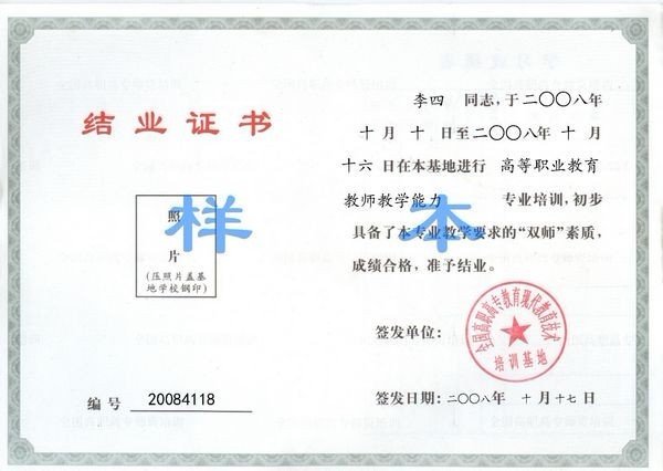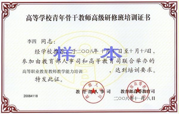 四、培训证书:经培训考核合格后颁发全国高职高专教育师资培训结业证书(双师素质证书),并同时由教育部人事司和高等教育司联合颁发高等学校青年骨干教师高级研修班培训证书。